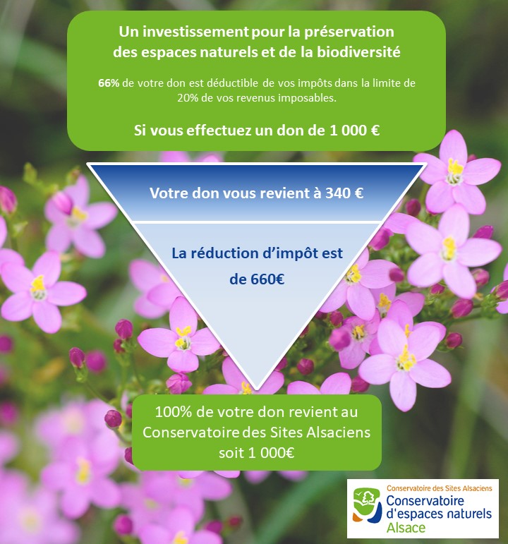 Ainsi, votre contribution est pleinement valorisée pour financer une action du Conservatoire des Sites Alsaciens, alors que vous pouvez bénéficier de la réduction fiscale sur la totalité de votre don (dans la limite de 20% de vos impôts).