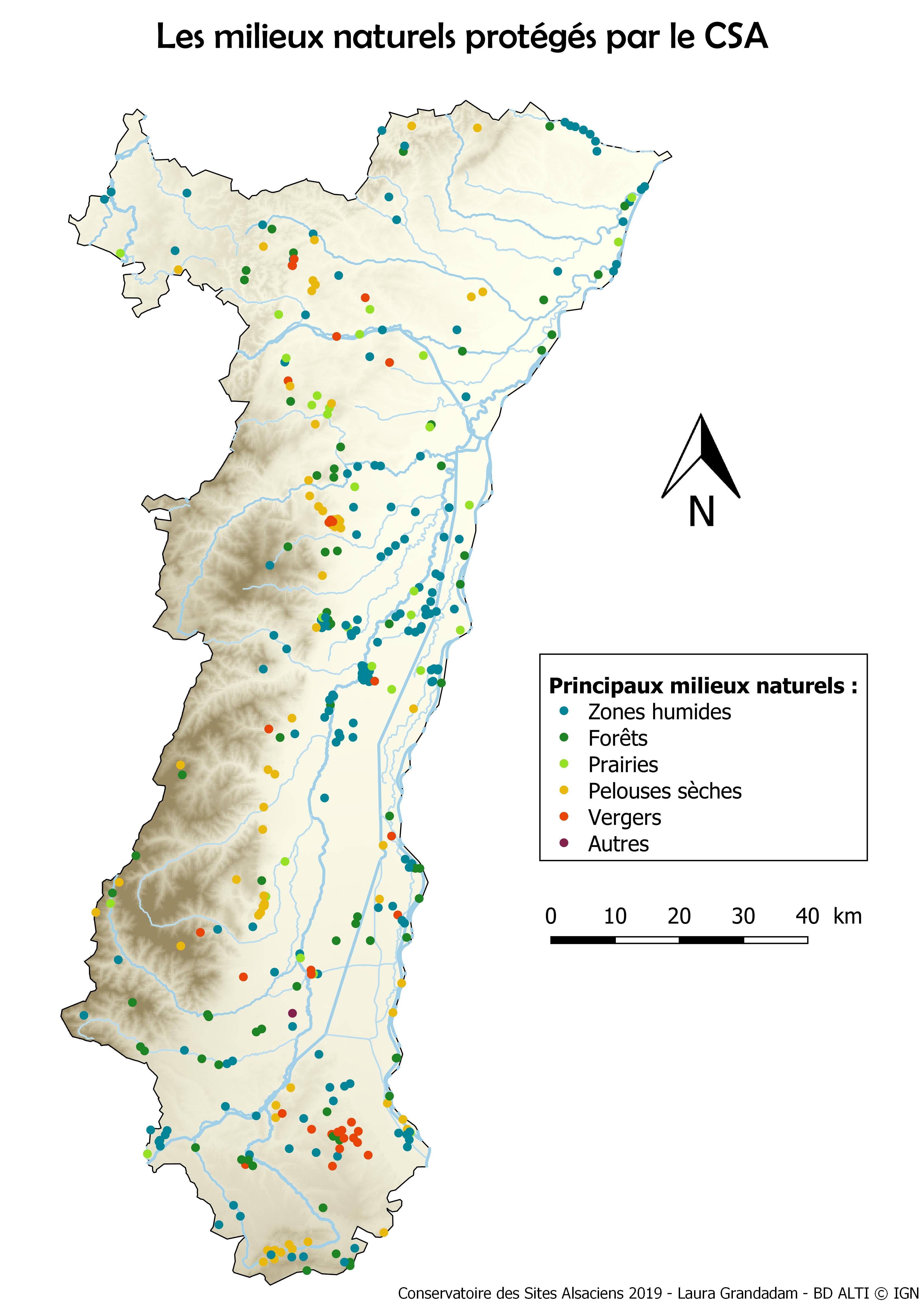 Voici la carte de répartition des sites protégés par le Conservatoire sur le territoire alsacien :