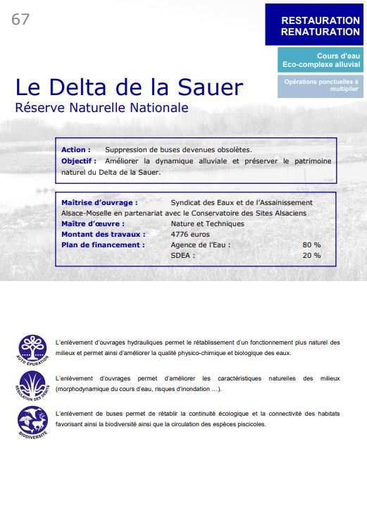 Écologique et d’un Espace Naturel Sensible du département du Bas-Rhin. Les travaux ont été réalisés sous maîtrise d’ouvrage du SDEA, dans le cadre de sa compétence GEMAPI (gestion des milieux aquatiques et la prévention des inondations) par délégation de la Communauté de Communes de Hanau-La Petite Pierre.